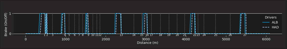 This project allows users to load the telemetry of F1 drivers across an F1 session. The main chart will display selected drivers laptimes and compounds used. Users then have the ability to select multiple laps, whihch will be displayed below the chart, and display detailed data of said laps. It is also possible to edit the color of the selected laps. The detailed graphs include: speed, throttle input, brake input, gears, RPM, delta and track dominance layout. The graphs include hover annotations to see data of specific points throughout the lap.