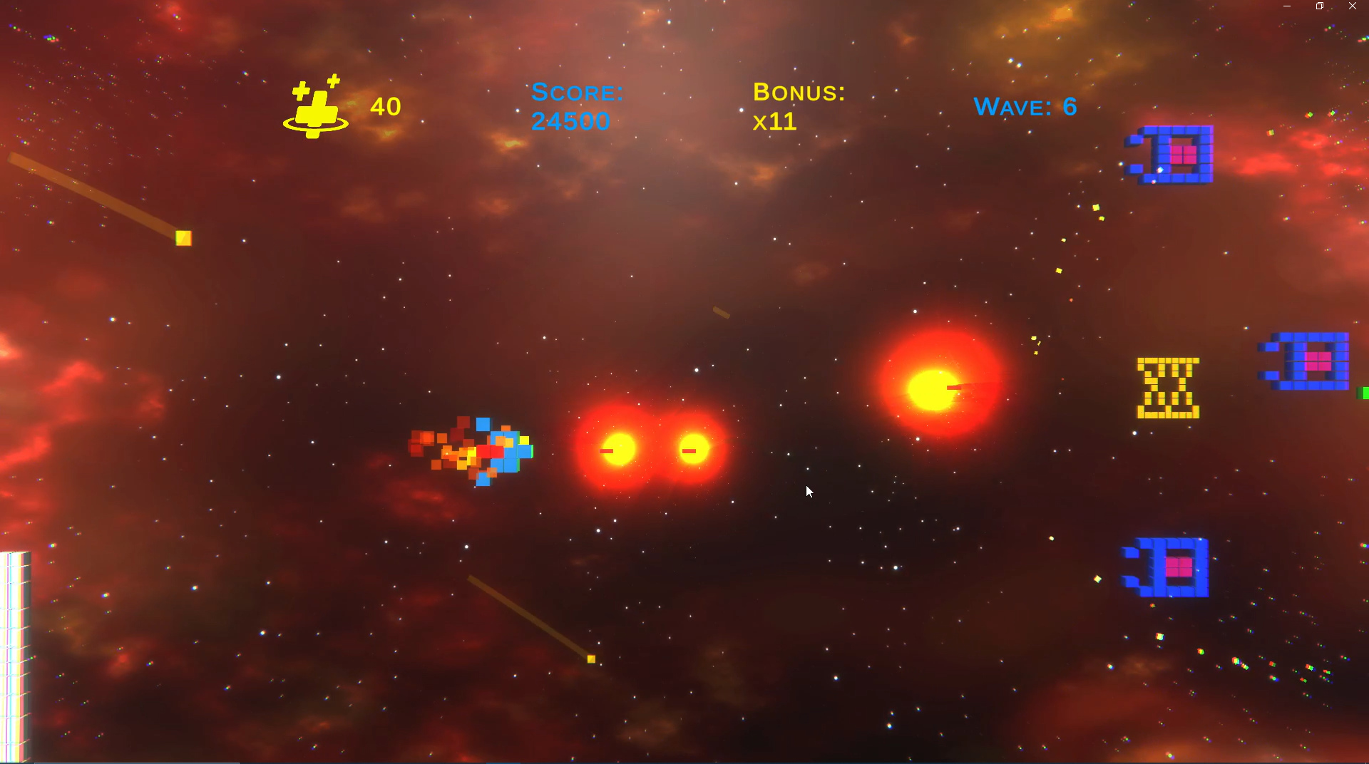 Given the focus this project had regarding feeling, aesthetics and enemy behaviour, I spent most of the time working on the design features of the project. I also implemented the beahaviour of some of the enemies and features of the player (spaceship).